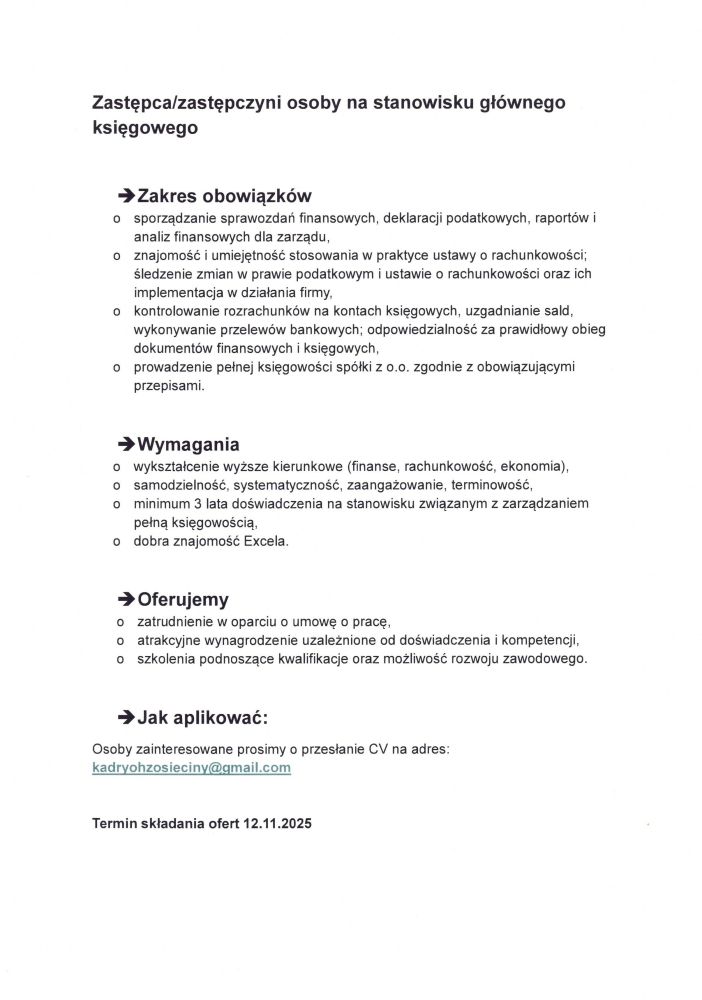 Osoby zainteresowane prosimy o przesłanie CV na adres: kadryohzosieciny@gmail.com Termin składania ofert 12.11.2025 Szczegóły w załączeniu.